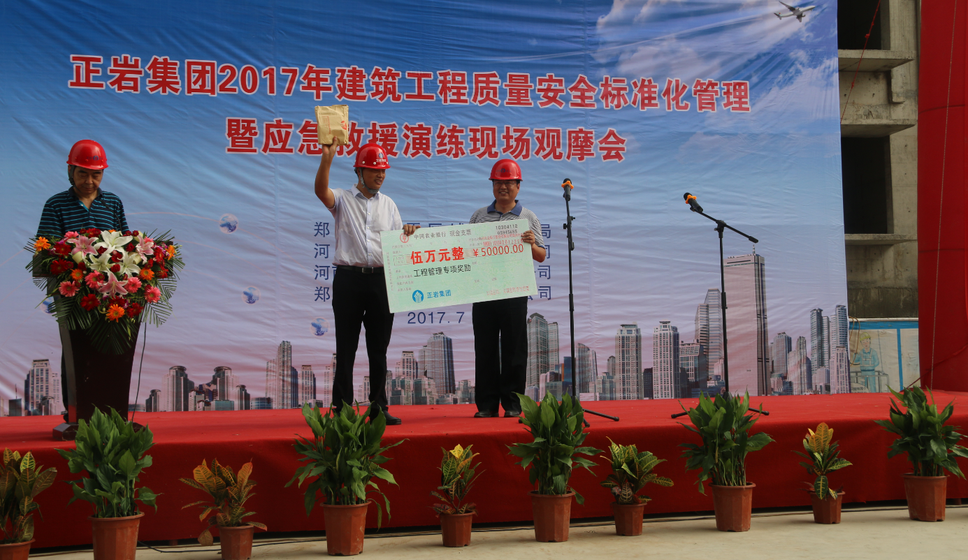 会议由集团公司总经理师忠敏主持,集团公司董事长王俊岭对本次观摩会致辞,永威三王庄滨河花园2号院项目经理王廷然做了项目质量安全标准化管理交流发言,河南省永威置业潘总在讲话中充分肯定了集团公司实施质量安全标准化管理的成绩,中原区建设局领导也对项目质量安全标准化管理工作给予了高度评价。会上,董事长王俊岭向永威三王庄项目部颁发了5万元工程质量安全标准化先进管理专项奖励。