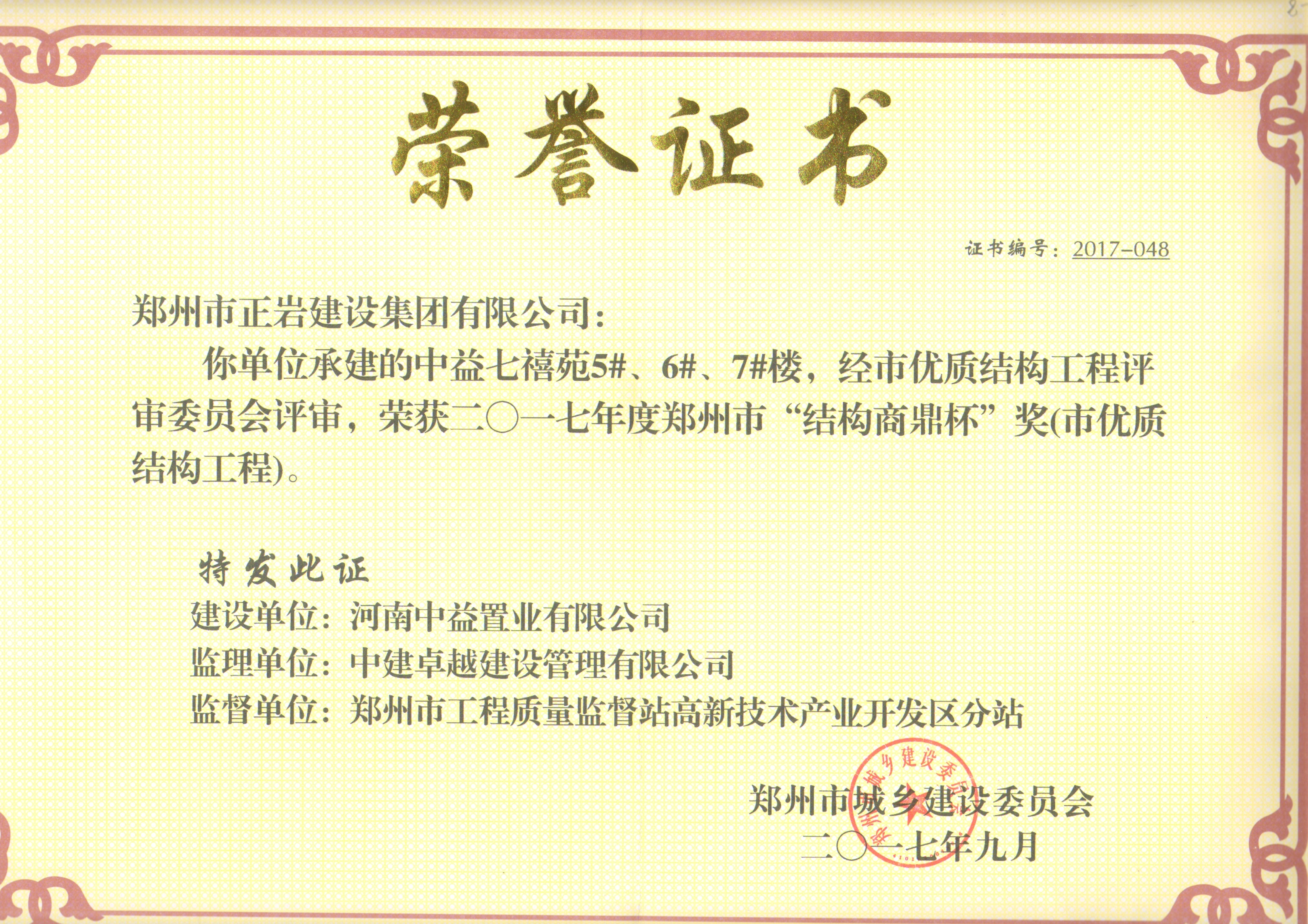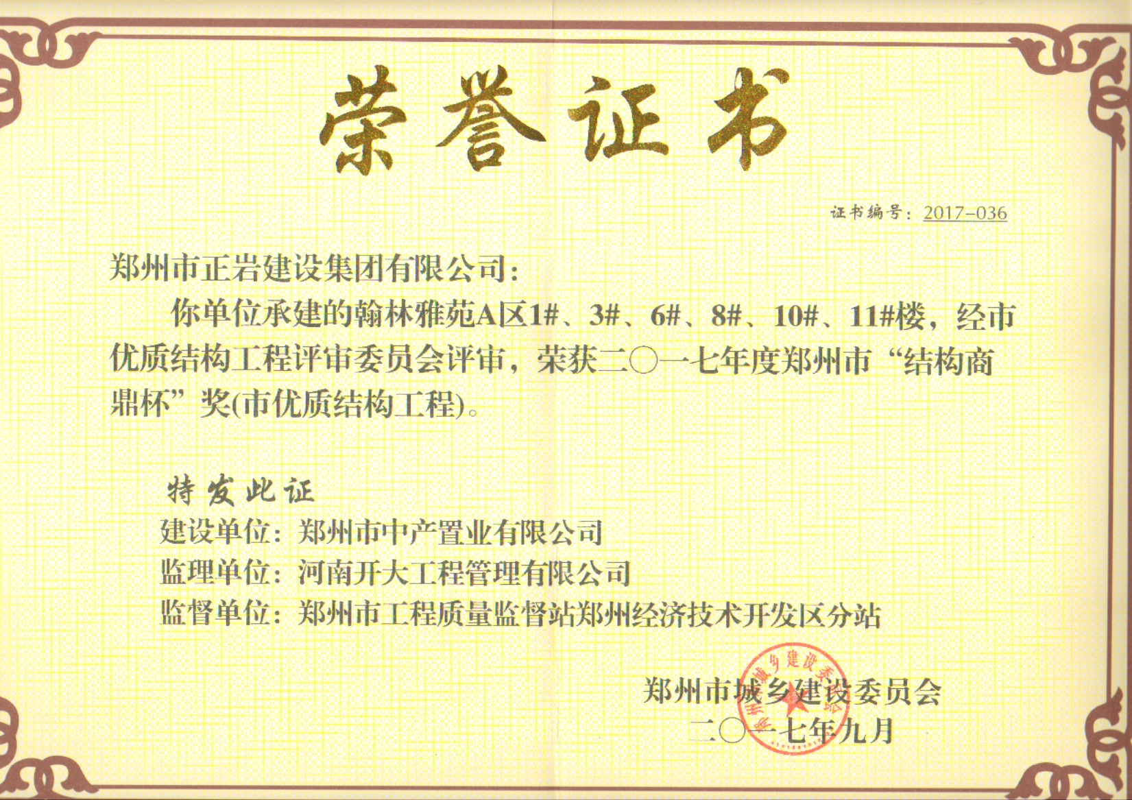 祝贺永威枫香庭西院一期、翰林雅苑A区、中益七禧苑项目荣获郑州市“结构商鼎杯”奖(市优质结构工程)