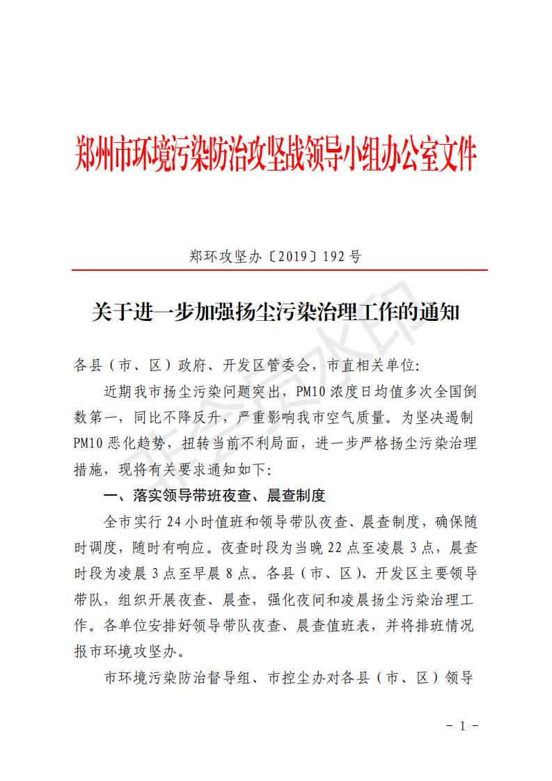 郑环攻坚办【2019】192号关于进一步加强扬尘污染治理工作的通知