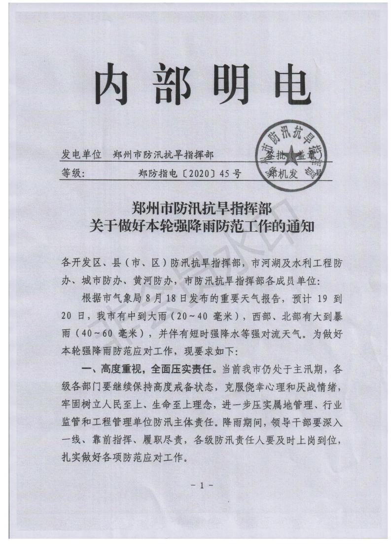 郑州市防汛抗旱指挥部关于做好本轮强降雨防范工作的通知